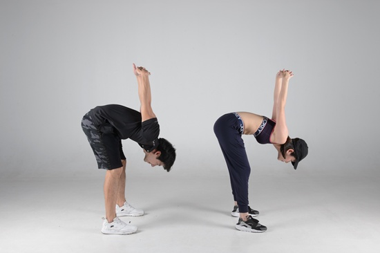 * ท่าที่ 1 นำมือทั้ง 2 ข้างผสานกันไว้ข้างหลัง ยืดอกขึ้น แล้วค่อยๆ ดึงไหล่ไปทางด้านหลัง ค้างไว้ 5-10 วินาที จากนั้นค่อยๆ ก้มลง แล้วยกแขนขึ้น ค้างไว้อีก 5-10 วินาที แล้วยืดตัวขึ้น เพื่อยืดกล้ามเนื้อส่วนแขนและหลัง