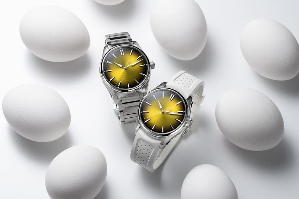 H. Moser & Cie. รังสรรค์นาฬิกาชั้นสูง Pioneer Centre Seconds Sunny-Side Up รุ่นสตีล สายรับเบอร์สีขาว ตัวเรือนเนื้อสตีลขนาด 40 มม. กระจกหน้าปัดทรงโดม ฝาหลังโปร่งใส เม็ดมะยมแบบขันเกลียวตกแต่งอักษร “M” กันน้ำลึก 12 ATM หน้าปัดฟูเม่สีเหลืองลวดลายซันเบิร์สต์ โลโก้ H. Moser & Cie. เคลือบแลกเกอร์ใส ขีดเครื่องหมายบอกเวลาแบบขัดเหลี่ยมมุม ขีดหลักชั่วโมงเคลือบสารเรืองแสง Super-LumiNova® เข็มชั่วโมงและนาทีทรงใบไม้เคลือบสารเรืองแสง Super-LumiNova® กลไกอัตโนมัติ สำรองพลังงานอย่างน้อย 3 วัน ฟังก์ชั่น Hacking seconds หยุดเข็มวินาทีเมื่อดึงเม็ดมะยมออก เพื่อการปรับตั้งเวลาที่แม่นยำที่สุด