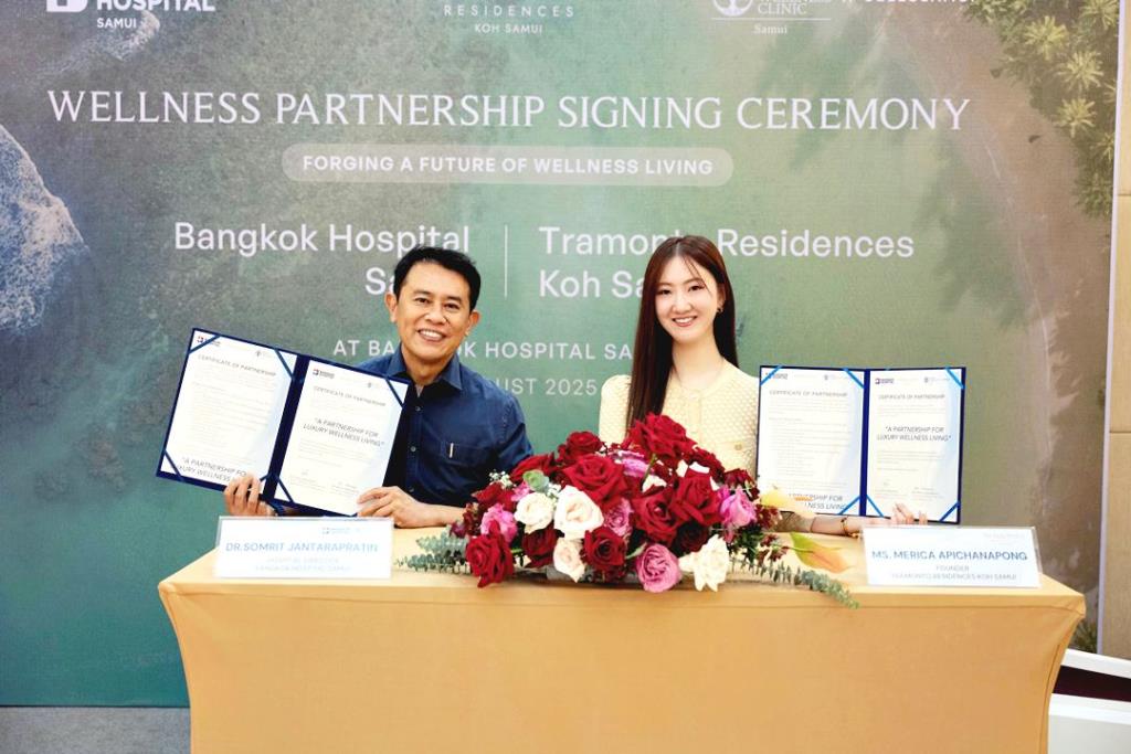 Tramonto Residences โครงการบ้านพักอาศัยระดับลักชัวรี และโรงพยาบาลกรุงเทพสมุย นำโดยนายแพทย์ สมฤทธิ์ จันทรประทิน ผู้อำนวยการโรงพยาบาลกรุงเทพสมุย และ Merica Apichanapong, Founder and CEO, Out of Office Co., Ltd. (Tramonto Residences) ร่วมลงนามบันทึกข้อตกลงความร่วมมือเชิงยุทธศาสตร์ เพื่อส่งมอบประสบการณ์การใช้ชีวิตที่ผสานสุขภาพแบบองค์รวมเข้ากับสถาปัตยกรรมและไลฟ์สไตล์ระดับโลก ตลอดจนการส่งมอบประสบการณ์ด้านการดูแลสุขภาพแบบองค์รวมผ่านแพ็กเกจการดูแลสุขภาพต่าง ๆ จาก BDMS Wellness Clinic Celes Samui แก่คอมมูนิตี Tramonto Residences