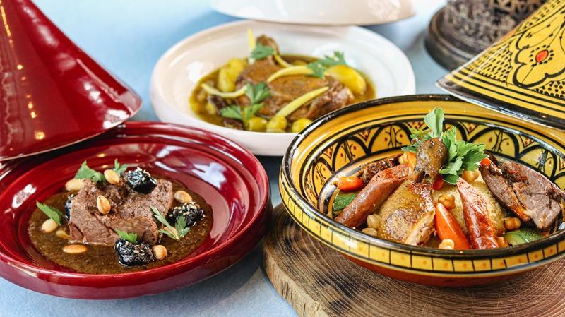 การเดินทางด้วยรสชาติ เริ่มต้นด้วยอาหารเรียกน้ำย่อย อาทิ ไข่ชักชูก้า (Shakshuka Egg) เมนูไข่ที่มาพร้อมกับมะเขือเทศใส่เครื่องเทศ พริกหยวกและสมุนไพร เสิร์ฟพร้อมแป้งแผ่นสไตล์อาหรับ ซุปฮาริร่า (Harira Soup) ทำจากถั่วชิกพี ถั่วเลนทิลและมะเขือเทศรสชาติดั้งเดิม โรยด้วยผักชีสดและบีบมะนาวเพิ่มรสชาติให้กลมกล่อมขึ้น พาสติลา (Pastilla) เมนูอันเลี่ยงชื่อ ทำจากแป้งฟีโลสอดไส้ไก่ใส่เครื่องเทศ อัลมอนด์ อบเชย โรยผงน้ำตาล รูปทรงคล้ายปอเปี๊ยะและเสิร์ฟพร้อมซอสพริกฮาริสซา