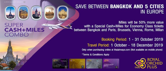 เส้นทางไป-กลับ กรุงเทพฯ สู่ ปารีส บรัสเซลส์ เวียนนา มิลาน โรม ใช้จำนวนไมล์สะสมเริ่มต้นที่ 13,000 ไมล์ และเพิ่มเงิน 13,000 บาท (ไม่รวมภาษีสนามบินและค่าธรรมเนียมทุกประเภท)